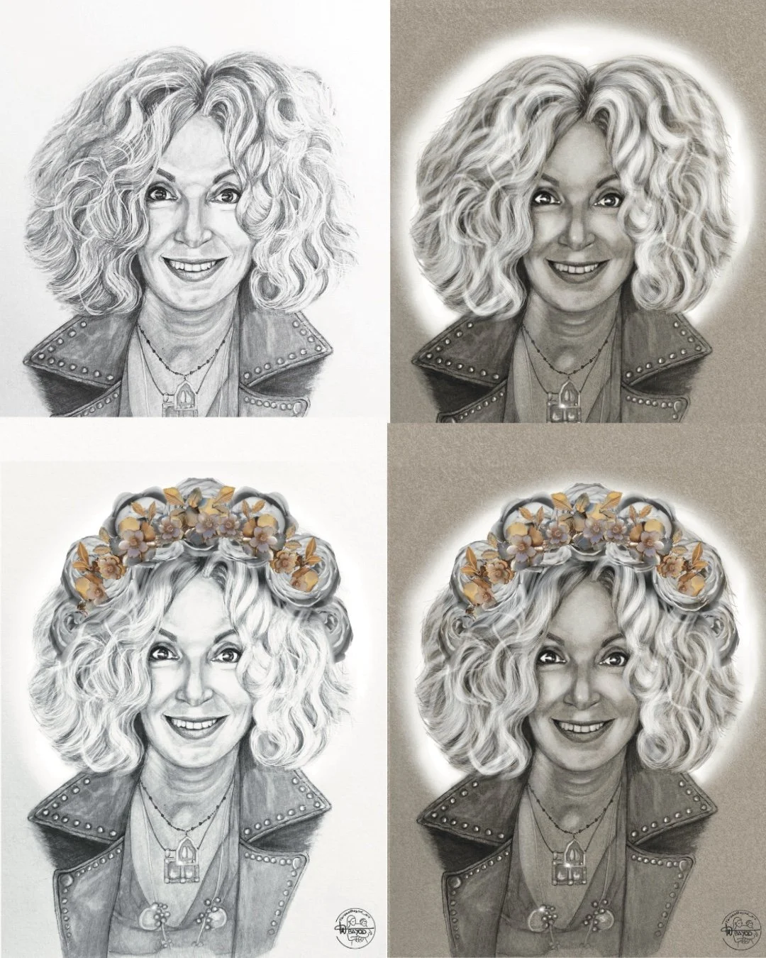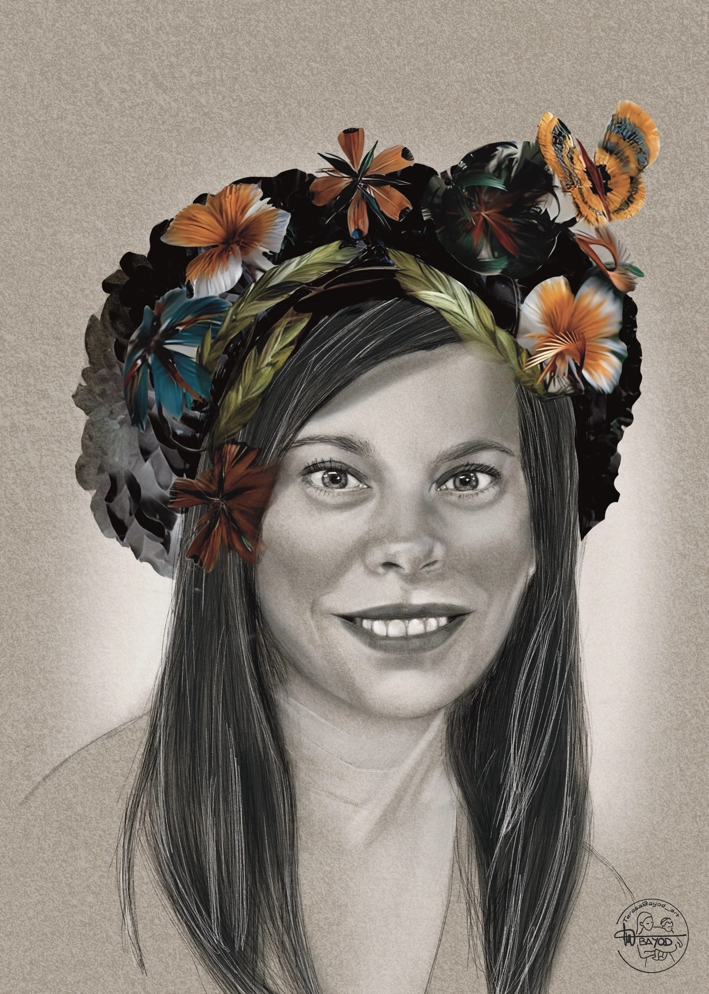 Digitalizo el original a lápiz y añado flores, luces, detalles y un fondo.
